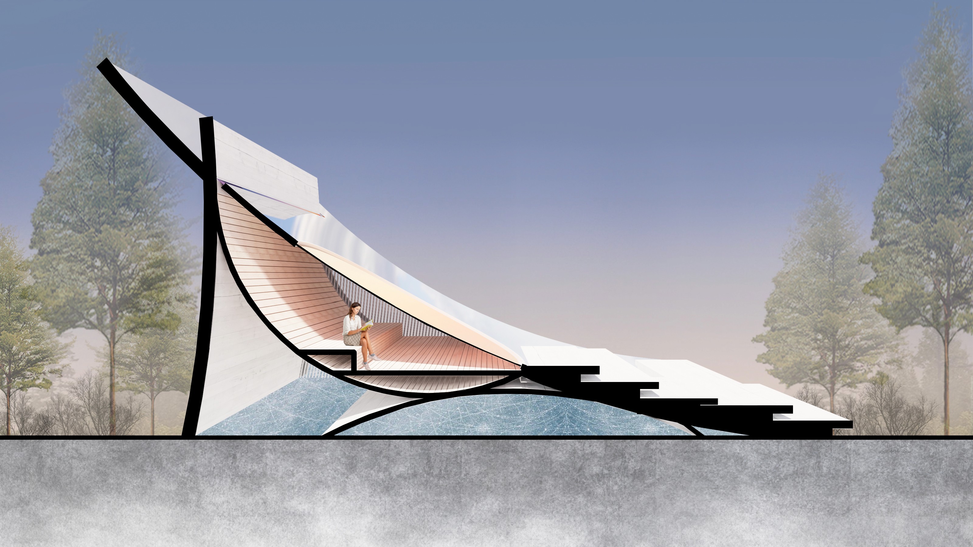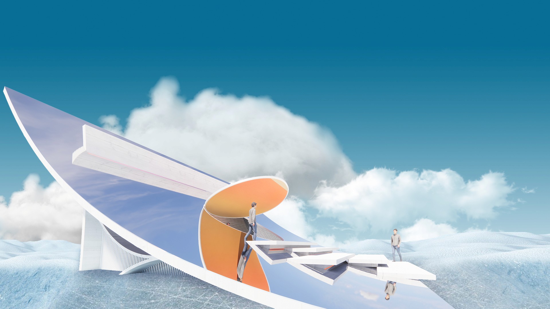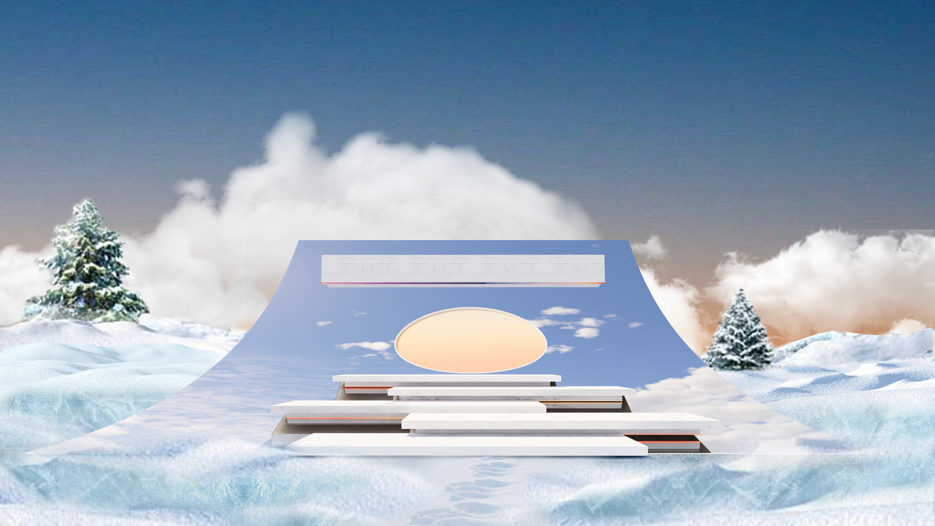 The sun bestows upon us a warm and blissful energy. The design vision aims to reinterpret the sun, creating an illusion of closeness to its brilliance. Situated on the ice surface of the Nestaweya River, this pavilion seeks to foster interaction between visitors and nature. The structure is composed of a framework based on three tangent circles and one intersecting circle, forming the sky, while a circular gate embodies the sun. The main façade is clad in mirror-like metal, designed to capture and reflect the sky, giving the impression that visitors are walking on air as they ascend the staggered steps. At the heart of the pavilion, a sun-shaped door made of colored glass serves as the focal point. Step by step, visitors traverse this skyward path until they reach—and even touch—the sun. This experience underscores the importance of harmonious coexistence with the environment and deepens the bond between humanity and the natural world. The exterior is finished with white wood, allowing the pavilion to blend seamlessly into the snowy landscape. Frosted glass panels along the sides create a sense of partial transparency, balancing openness with enclosure. Upon entering through the sun gate, visitors are greeted by an interior lined with warm-toned wood, offering a cozy refuge from the harsh outdoor winds. Inside, they can rest and warm themselves, experiencing a tangible contrast between the cold external environment and the inviting interior. This material distinction allows the pavilion to harmonize with its winter surroundings while providing a comforting, heated sanctuary.