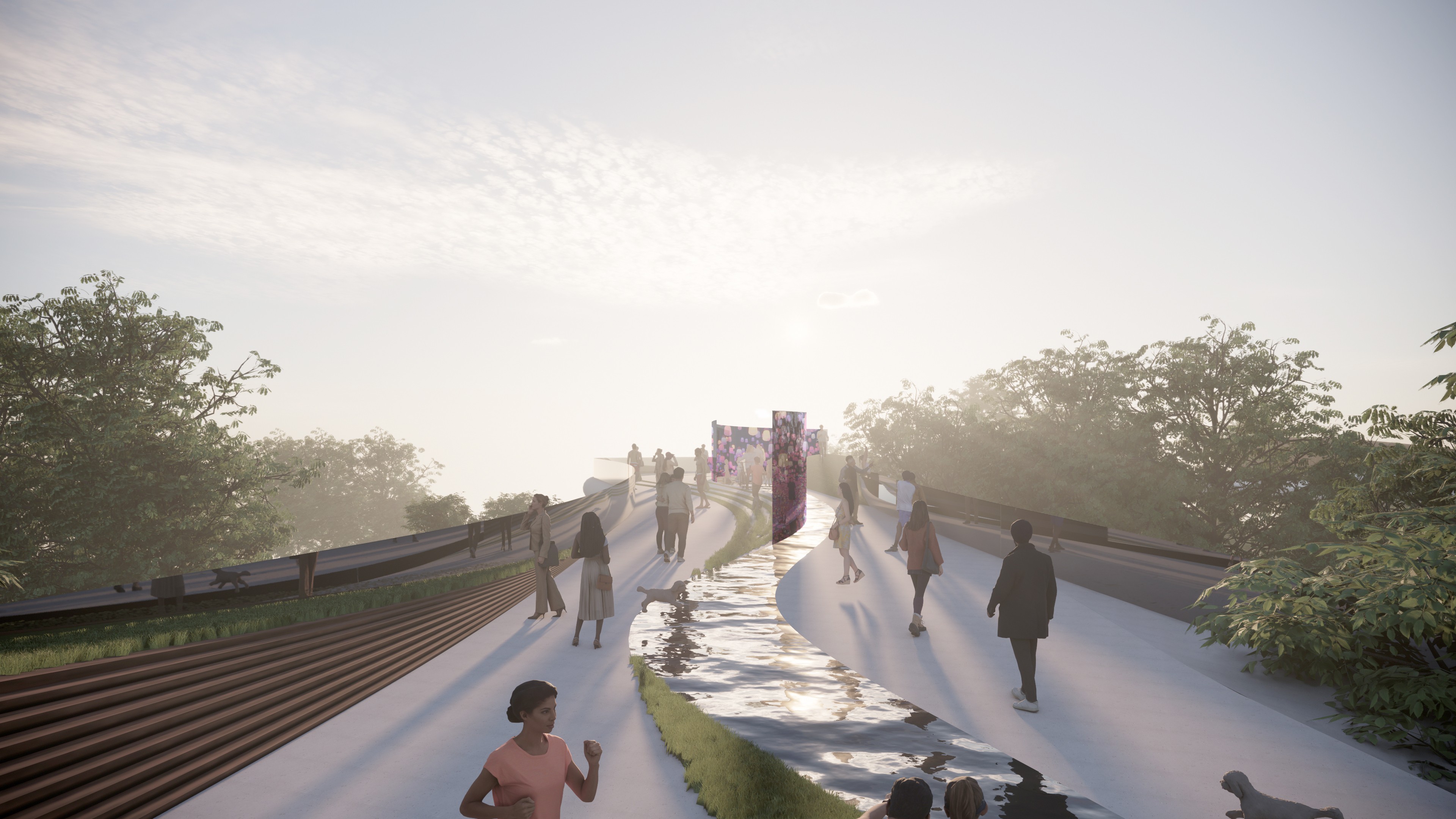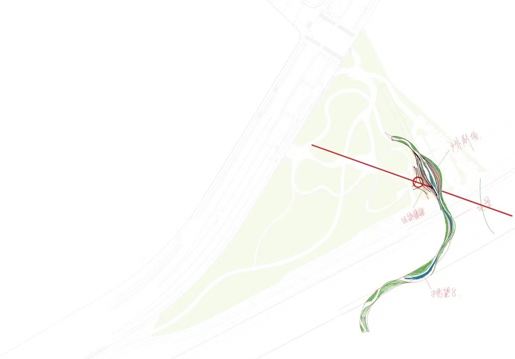 Wuhan is a historic city where ancient heritage and modern development meet along the Yangtze River, embodying the river's fluidity and enduring beauty. As the city pursues its vision of becoming a "City of a Thousand Parks" through pocket gardens, this project builds on existing mountain-and-water park concepts, proposing a high-line park strategy. The design weaves the city with the river, drawing people from the urban edge toward the water. The bridge expands and contracts—widening into viewing platforms, narrowing into pathways—creating a rhythmic play of openness and intimacy. Platforms intersect and extend, forming a new bridge where blue interactive water features and green planting intertwine, crafting a restorative third space. Within this layered flow, five loops emerge: green, water, pedestrian, art, and sport—each a different rhythm in the same choreography.